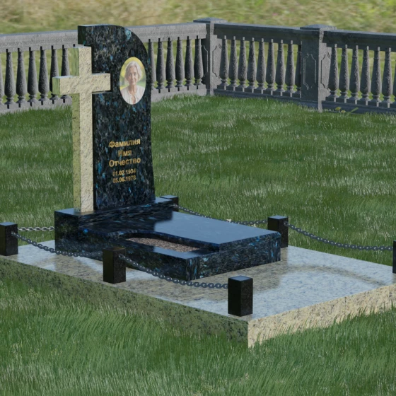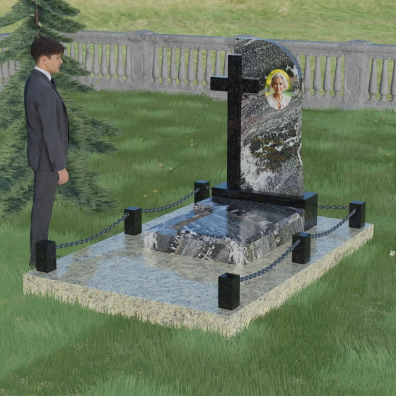 Каждый элемент этого надгробия несет в себе скрытый смысл. Высокий крест, интегрированный в саму структуру камня, выступает символом духовного покровительства и незыблемой веры. Асимметричная форма стелы олицетворяет жизненный путь, который никогда не бывает абсолютно ровным, но всегда стремится вверх, к свету. Массивное основание и каменное ограждение с цепями символизируют крепость семейных уз и нерушимую границу между суетным миром и вечным покоем. Эта форма вызывает чувство защищенности и монументальности, подчеркивая, что память о дорогом человеке так же тверда и вечна, как сам гранит.