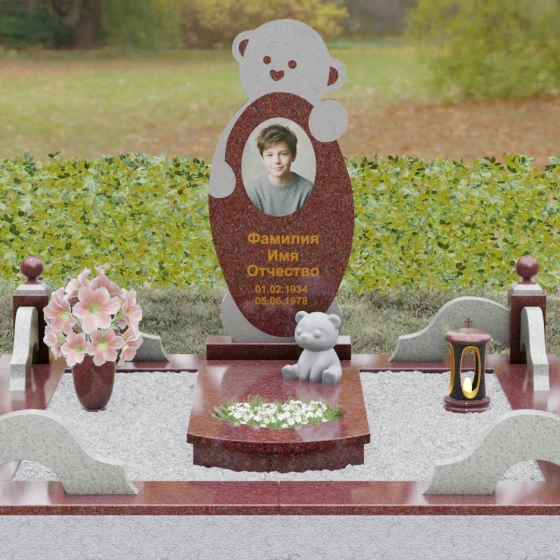 • Скульптурное дополнение: У подножия основной стелы расположена миниатюрная фигурка медвежонка, вырезанная из светлого камня, которая дублирует главный мотив и делает мемориал еще более трогательным.
