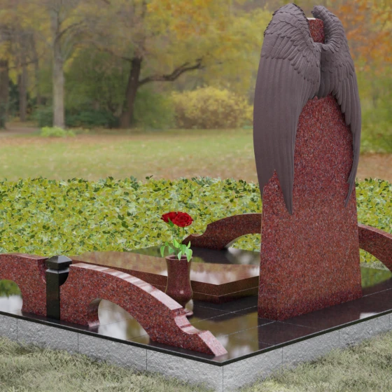 Данное ритуальное изделие (артикул 161) представляет собой подлинное воплощение тихой скорби и небесного покровительства. В центре художественной композиции находится вертикальная стела, которую бережно, словно в последнем земном объятии, обрамляют два резных ангельских крыла. Плавность изгибов этих элементов символизирует чистоту души и бесконечный жизненный путь, переходящий в вечный покой. Мастера уделили особое внимание детализации: каждое перышко на крыльях проработано с ювелирной точностью, создавая глубокий рельеф и объем, который эффектно контрастирует с идеально гладкой, зеркальной поверхностью основной части камня.