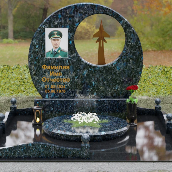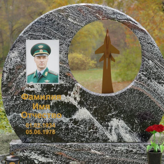 Выбор мемориальной композиции — это всегда поиск баланса между земной скорбью и небесным триумфом человеческого духа. Данная величественная стела, выполненная в уникальной геометрии круга с асимметричным сквозным вырезом, представляет собой не просто памятный знак, а глубокое философское высказывание. Символизм окружности отсылает нас к идее бесконечности, небесного свода и завершенности жизненного пути. Внутреннее пространство стелы акцентировано филигранной металлической фигурой взмывающего ввысь истребителя. Этот элемент несет в себе мощный эмоциональный заряд: он олицетворяет прорыв сквозь земные преграды, вечный полет и верность призванию, которое сильнее самой смерти.