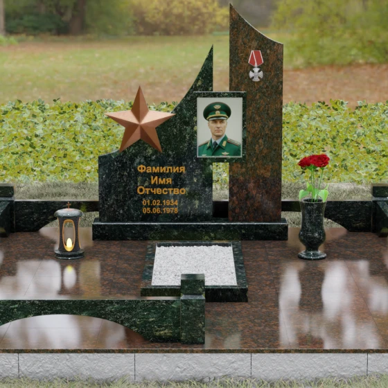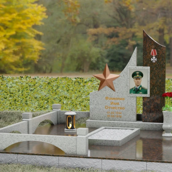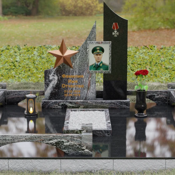 В основе художественной концепции лежит динамичная асимметрия, которая придает всей структуре современный, «европейский» облик. Центральная стела состоит из двух контрастных блоков, объединенных общим основанием. Левая часть, выполненная из темного полированного камня, имеет резкий диагональный срез, направленный вверх. На ее вершине закреплена объемная пятиконечная звезда с эффектом бронзового напыления — мощный акцент, подчеркивающий статус и заслуги покойного. Правая часть композиции представляет собой высокий вертикальный пилон из фактурного коричнево-красного гранита, на верхнем сегменте которого расположена детальная реплика ордена Мужества.