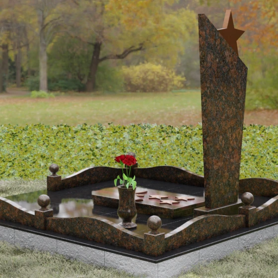 Основу композиции составляет массивное каменное полотно с уникальной асимметричной геометрией. Верхний край обелиска уходит в резкий диагональный подъем, создавая динамичный силуэт, устремленный к небесам. Венчает эту вершину объемная пятиконечная звезда — символ, выполненный в теплом бронзовом оттенке, который эффектно контрастирует с основным цветом камня. Зеркальная полировка лицевой грани доведена до эталонного блеска: поверхность буквально оживает, отражая окружающий мир и создавая глубину, в которой запечатлен портрет. Прямые, строгие линии боковых граней подчеркнуты аккуратными фасками, что придает всей конструкции архитектурную завершенность и визуальную легкость при сохранении колоссальной физической прочности.