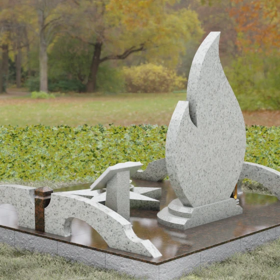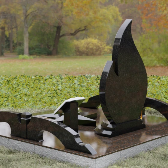Центральное мемориальное изделие выполнено в уникальной форме застывшего пламени, которое стремится ввысь, символизируя неугасаемую энергию жизни. Плавные, текучие изгибы боковых граней переходят в изящное заостренное навершие, создавая динамичный и одновременно строгий силуэт. Особое внимание стоит уделить обработке камня: по всему периметру лицевой грани снята широкая фаска, которая благодаря безупречной зеркальной полировке создает великолепную игру света и тени, подчеркивая объем и скульптурность формы.