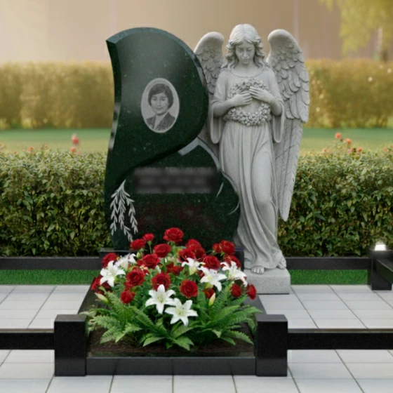 Этот мемориальный комплекс являет собой воплощение скорби и светлой надежды, где центральное место занимает скульптура ангела, словно оберегающего покой ушедшего. Плавные линии стелы, дополненные изящной гравировкой, контрастируют с монументальностью основания, создавая гармоничный и запоминающийся образ. Благодаря возможности выбора из восьми вариантов камня, включая семь видов гранита и благородный мрамор Тассос, памятник может обрести индивидуальный облик, соответствующий характеру и памяти дорогого человека.