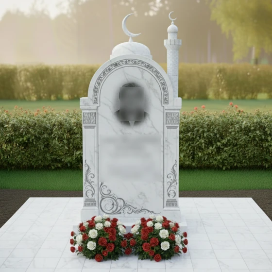 Форма арки в данной композиции глубоко символична: она олицетворяет небесные врата и переход в вечный мир, дарующий душе долгожданный покой. Купол и минарет подчеркивают религиозную принадлежность и духовную крепость веры усопшего. Цветочный орнамент у основания символизирует добрые дела и те ростки светлой памяти, которые остаются в сердцах близких. Это изваяние словно защищает покой близкого человека, создавая вокруг него атмосферу умиротворения и божественной защиты.