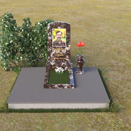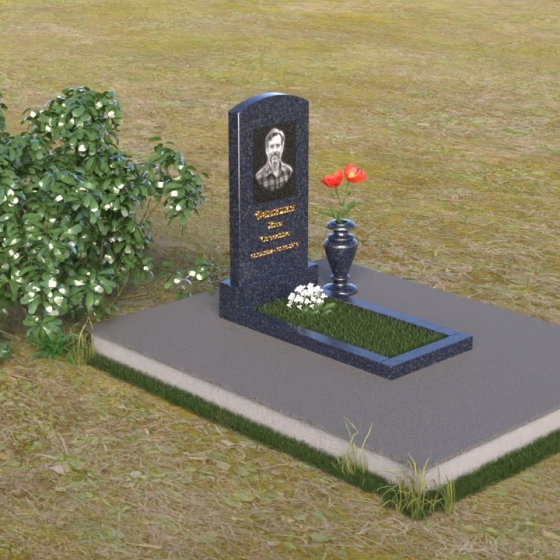 Благодаря своей лаконичной форме, эта стела предоставляет широкие возможности для оформления. Портрет усопшего будет гармонично смотреться как в верхней части стелы, так и чуть ниже центра. Золотое тиснение имени и дат жизни будет элегантно выделяться на фоне полированного камня, создавая четкий и легко читаемый образ. Небольшая тумба, расположенная перед стелой, может служить местом для возложения цветов и памятных вещей. Мы рекомендуем выбирать для этой модели сдержанные, лаконичные шрифты, которые подчеркнут общую элегантность композиции. Подумайте о возможности добавления небольшого бронзового барельефа или скульптуры, отражающей профессию или увлечения ушедшего человека. Это добавит индивидуальности и сделает место памяти еще более личным и значимым. Ваза, выполненная в едином стиле с монументом, завершит композицию и придаст ей законченный вид.