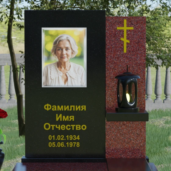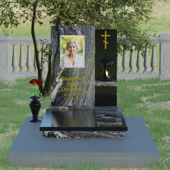 Кому подойдет: Данная модель является универсальной благодаря своему лаконичному и одновременно глубокому дизайну. Она станет достойным выбором как для мужчины, так и для женщины. Строгость линий и золотые акценты подчеркнут статус и мужество, а плавные изгибы верхней грани привнесут нотки женственности и нежности. Этот мемориал выбирают те, кто хочет выразить глубокое уважение и создать на кладбище место, преисполненное достоинства и тишины, где каждый элемент — от лампады до фактуры камня — говорит о вечной любви.