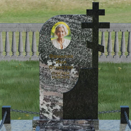Выбор мемориального комплекса — это всегда глубоко личный процесс, стремление выразить в камне ту любовь и уважение, которые мы храним в сердце. Модель под артикулом 019 создана для тех, кто ценит благородную асимметрию и глубокий символизм. Величественная стела представляет собой сложную художественную композицию, в которой мастерски скомбинированы две контрастные фактуры. Левая часть памятника имеет мягкий, плавный изгиб, символизирующий завершенный жизненный путь, наполненный светом и душевным теплом. Правая же сторона акцентирована монументальным православным крестом, который является не просто элементом оформления, а неотъемлемой частью самой конструкции.