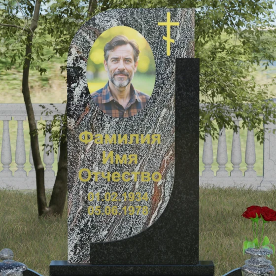Данная модель отличается уникальной комбинированной архитектурой, которая мгновенно приковывает взгляд за счет игры форм и цветов. Основная вертикальная стела имеет асимметричный силуэт: ее левая сторона плавно закругляется, образуя изящную волну, в то время как правая грань остается подчеркнуто строгой и прямой. Это сочетание мягкости и твердости символизирует дуальность жизни. С правой стороны стелу дополняет контрастная вертикальная вставка из камня другого оттенка, которая придает всей конструкции объем и архитектурную завершенность. В верхней части основной плиты лаконично расположен православный восьмиконечный крест, выполненный методом глубокой гравировки с последующим золочением. Его строгие линии подчеркивают духовную значимость монумента, не перегружая общую композицию лишними деталями.