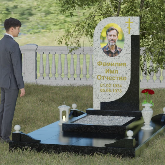 Кому подойдет: Данная модель является универсальной и гармонично впишется в мемориальный комплекс как для мужчины, так и для женщины. Асимметричная форма с плавным изгибом придает памятнику определенную легкость, что часто выбирают для оформления захоронений матерей или жен. В то же время строгая вертикальная колонна и золоченая символика делают его подходящим для увековечивания памяти отца, брата или главы семейства. Это выбор тех, кто ценит эстетику минимализма, надежность натуральных материалов и хочет подчеркнуть преемственность поколений и крепость семейных уз.