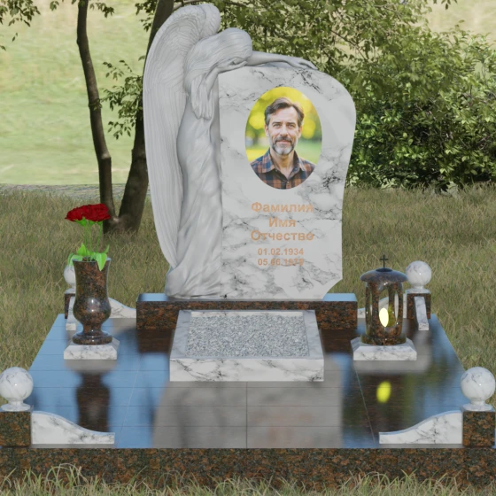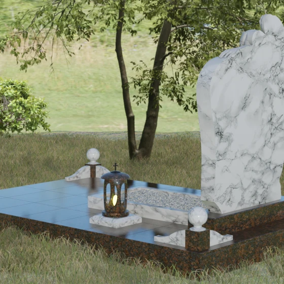 Форма этого надгробия лишена агрессивных острых углов в верхней части, что придает ему мягкость и одухотворенность. Асимметричная верхушка основного массива плавно огибает фигуру ангела, создавая ощущение защиты и покровительства. С точки зрения символизма, ангел здесь выступает не только как страж души, но и как медиатор между мирами, разделяющий горечь утраты с живыми. Каменные шары на столбиках ограждения отсылают к вечности и бесконечности бытия. Массивность основания и использование цельных плит для мощения участка олицетворяют устойчивость памяти, которую не в силах разрушить ни ветры, ни дожди.