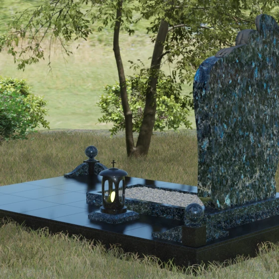 Благоустройство участка выполнено с учетом канонов высокой эстетики и практичности. Основной массив установлен на массивный гранитный цоколь, подчеркивающий надежность всей конструкции. Периметр участка очерчен строгим каменным бордюром, на углах которого возвышаются полированные шары — символы совершенства и завершенности жизненного цикла. Открытый цветник заменен на элегантную надгробную плиту с декоративной отсыпкой из светлой гальки, что не только создает законченный вид, но и значительно упрощает уход за местом памяти. Дополняют ансамбль изящная гранитная ваза для живых цветов и закрытая лампада, чей свет будет защищен камнем в любые непогоды.