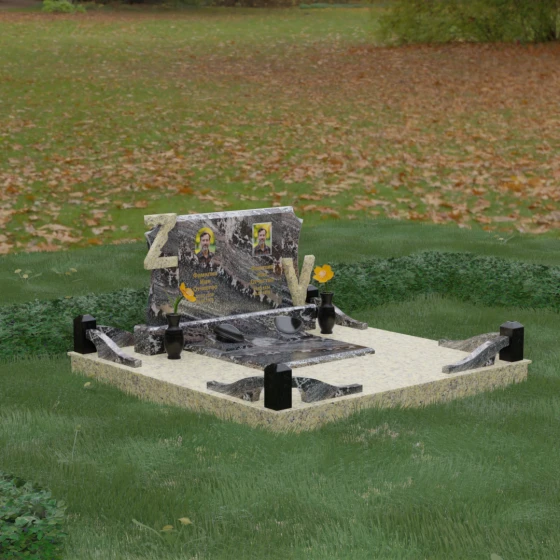 Центральным элементом изделия является массивная горизонтальная стела, обладающая сложной многоуровневой геометрией. Верхняя грань плиты украшена изящными симметричными вырезами, которые смягчают строгость прямоугольных форм и придают конструкции завершенный, эстетически выверенный вид. Особое внимание привлекает игра контрастов: глубокая зеркальная полировка основного массива камня эффектно подчеркивается светлыми вставками. Рельефные буквы Z и V, выполненные из контрастного гранита, выступают над поверхностью, создавая впечатляющий эффект объема и наделяя монумент уникальным характером.