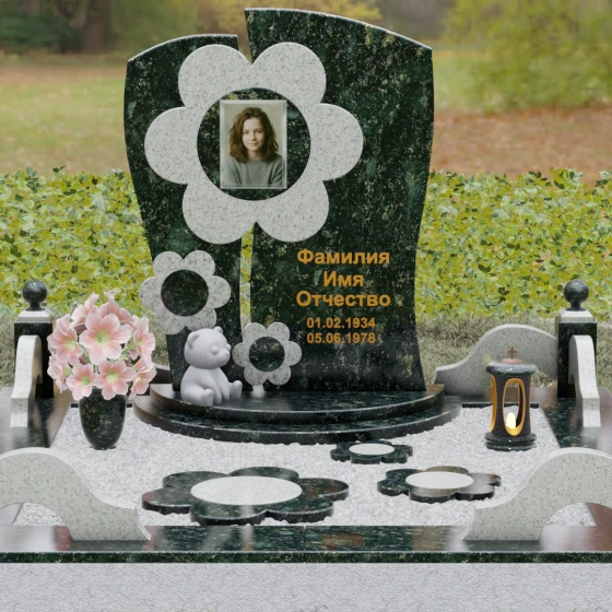 Представленный мемориальный ансамбль (Артикул 241) — это не просто памятник, а подлинное художественное произведение, в котором застыла нежность и вечная весна. В центре композиции находится величественная стела, выполненная в уникальной комбинированной технике. Ее асимметричная форма с деликатным вертикальным разделением создает динамичный и в то же время гармоничный силуэт. Главным акцентом является искусно вырезанный из камня цветок, в сердцевину которого помещен портрет. Плавные, округлые лепестки символизируют чистоту и хрупкость жизни, а их объемная фактура создает удивительную игру света и тени, контрастируя с глубокой зеркальной полировкой основного полотна стелы.