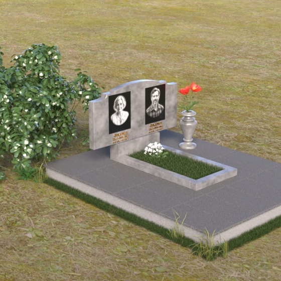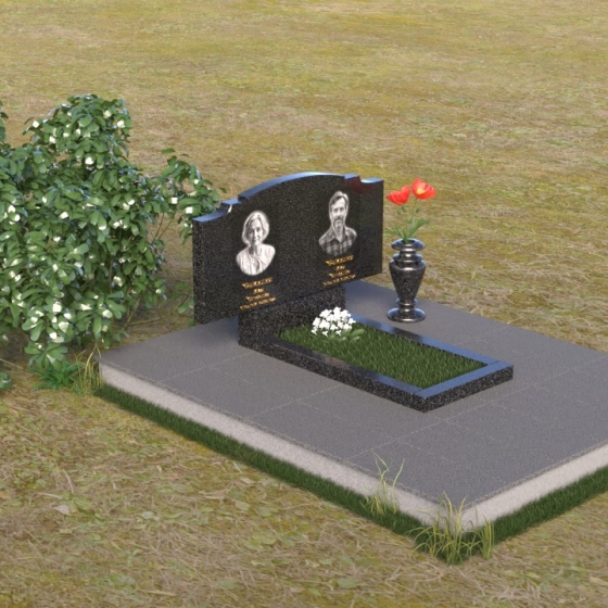 Этот гранитный монумент представляет собой композицию, где каждая деталь продумана до мелочей. Верхняя часть памятника имеет фигурную форму с плавными, волнообразными очертаниями, словно застывшая мелодия скорби. Верхний край обработан таким образом, что создает впечатление легкой, воздушной драпировки. Боковые грани аккуратно скруглены, смягчая строгость камня и придавая ему более изящный вид. Фаски, снятые по периметру, подчеркивают контур и добавляют выразительности. Лицевая поверхность отполирована до зеркального блеска, отражая свет и создавая ощущение глубины. На полированной поверхности выгравированы портреты усопших и памятные надписи, выполненные с особой тщательностью и вниманием к деталям. Под основной плитой располагается горизонтальная плита, также выполненная из черного гранита, создающая дополнительный уровень и подчеркивающая монументальность композиции. На ней размещена еще одна полированная плита, но уже меньшего размера, как символ нерушимости и продолжения рода.