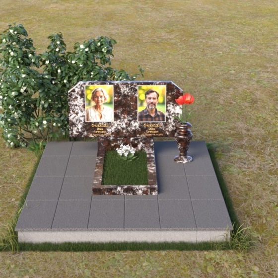 Этот ритуальное изделие (артикул ПГ027) – это не просто надгробный памятник, это способ выразить вашу любовь и уважение к ушедшему близкому человеку. Его строгая, но в то же время элегантная форма, с аккуратно скошенными углами верхней части, символизирует сдержанную скорбь и вечную память. Зеркальная полировка черного камня создает эффект глубины и объема, отражая небо и окружающий мир, словно напоминая о том, что душа усопшего нашла свой покой. Прямоугольная стела, установленная на подставке, выглядит лаконично и достойно. На полированной поверхности отчетливо видны портреты усопших, выгравированные с высокой точностью и детализацией. Композицию завершает ваза из того же материала, в которой можно разместить живые или искусственные цветы, как символ непреходящей любви и памяти. Одинокий красный мак, помещенный в вазу на изображении, служит трогательным акцентом, напоминающим о хрупкости жизни и необходимости ценить каждый момент.