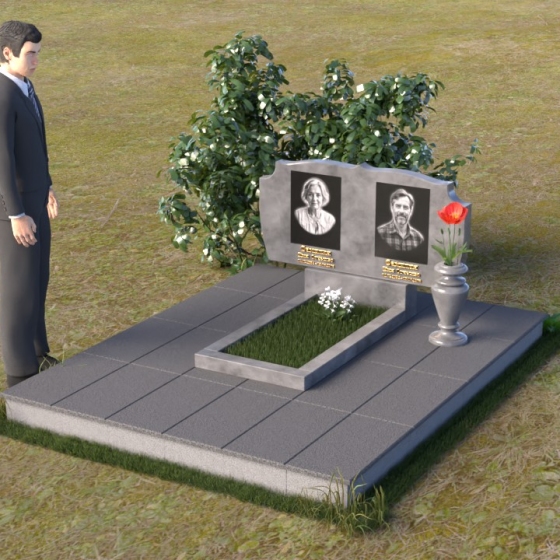 Композиция монумента строится на контрасте плавных линий и строгих геометрических форм. Верхняя часть, несущая на себе портреты усопших, имеет форму, напоминающую раскрытую книгу или свиток, где каждая страница хранит историю жизни. Края этого "свитка" искусно обработаны: верхняя грань словно оплавлена временем, приобретая мягкие, неровные очертания, а боковые стороны имеют более четкий, но все же сглаженный профиль. Фаска, идущая по периметру, придает верхней части визуальную легкость, отделяя ее от основания. Нижняя часть представляет собой прямоугольную плиту с зеркальной полировкой, отражающей небо и окружающий мир, создавая эффект бесконечности и связи с ушедшим. Она словно портал, соединяющий мир живых и мир мертвых, напоминая о непрерывности бытия. Боковины плиты имеют четкую геометрию, подчеркивая основательность и незыблемость памяти.