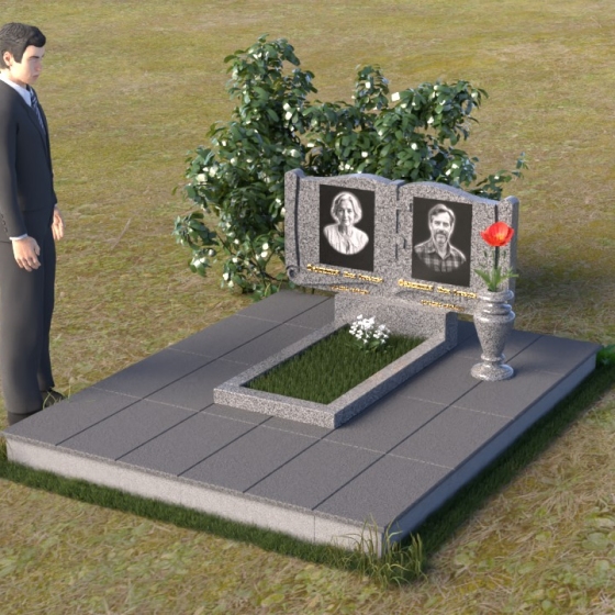 Ритуальное изделие ПГ036 представляет собой сдержанную, но исполненную достоинства композицию, созданную для сохранения памяти о близких. Два прямоугольных элемента стелы, соединенные вместе, образуют волнистый верх, напоминающий раскрытую книгу судеб. Грани обеих частей искусно обработаны, создавая мягкий, обтекаемый силуэт. Зеркальная полировка черного гранита служит идеальным фоном для гравировки портретов и надписей, словно запечатлевая светлые воспоминания в вечном камне. Слева и справа, в верхней части стелы, вырезаны лаконичные кресты, символизирующие веру и надежду. Тонкие линии врезаются в полированную поверхность, создавая игру света и тени, и добавляя глубину изображению. Горизонтальная плита, расположенная перед стелой, выполнена из того же черного гранита с зеркальной полировкой, отражая небо и окружающий пейзаж, создавая ощущение легкости и воздушности. Вместе с тем, основание памятника выполнено из серого камня, что придает всей композиции устойчивость и основательность.