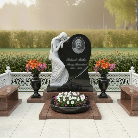 Эта мемориальная композиция, артикул ПН 103, представляет собой воплощение глубокой скорби и нежности, запечатленных в камне. В центре внимания — стела, выполненная в форме стилизованного сердца, которое плавно переходит в асимметричную волну. Этот изгиб не просто элемент дизайна, он символизирует бесконечность жизненного пути и неизбежность перехода в вечный покой, при этом сохраняя теплоту воспоминаний. Левая часть стелы увенчана изящной скульптурой скорбящей женщины. Её фигура, выполненная с невероятной детализацией, прислонилась к сердцу, выражая безмолвную печаль. Драпировка её одежд, кажется, струится по камню, создавая ощущение легкости и воздушности, несмотря на массивность материала. Контраст между зеркально отполированной поверхностью основного черного гранита и матовым, словно припорошенным инеем, срезом камня на фигуре скорбящей женщины, подчеркивает глубину эмоций и придает композиции особую выразительность. В правой части сердца, в обрамлении лаконичного овала, располагается место для портрета, словно медальон, хранящий драгоценный образ. Под портретом, на идеально гладкой поверхности, предусмотрено место для эпитафии, где каждое слово обретает особую значимость.