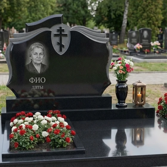 В основе композиции лежит монументальное надгробие, чья форма вызывает ассоциации с раскрытой книгой или древним свитком, символизируя жизненный путь, записанный в вечности. Плавные, волнообразные изгибы верхней части мемориальной плиты, напоминающие страницы, перелистываемые ветром времени, придают конструкции особую элегантность и динамику. В центре верхней части, на фоне глубокой черной полировки, вырезан лаконичный православный крест, выполненный в строгих, классических линиях, без излишних деталей, что подчеркивает его духовную значимость и чистоту веры. Крест, слегка утопленный в камень, создает игру света и тени, делая его объемным и выразительным. Ниже, в левой части надгробия, расположено искусно выполненное портретное изображение, обрамленное в овальную рамку, которая гармонично вписывается в общий контур. Под портретом предусмотрено место для имени и дат жизни, выгравированных четким и торжественным шрифтом, что завершает центральную часть композиции.