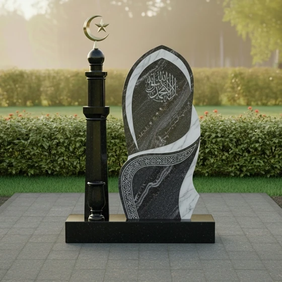 Слева от стелы возвышается вертикальный элемент, напоминающий минарет или обелиск, увенчанный символом полумесяца со звездой. Этот элемент имеет ступенчатую структуру, с несколькими горизонтальными выступами, которые придают ему солидность и величие. Его поверхность также идеально отполирована, создавая единую гармоничную композицию с основной стелой. Оба элемента установлены на массивное горизонтальное основание, выполненное из того же темного гранита. Это основание обеспечивает исключительную устойчивость всей конструкции, а его строгие, четкие линии подчеркивают монументальность и надежность.