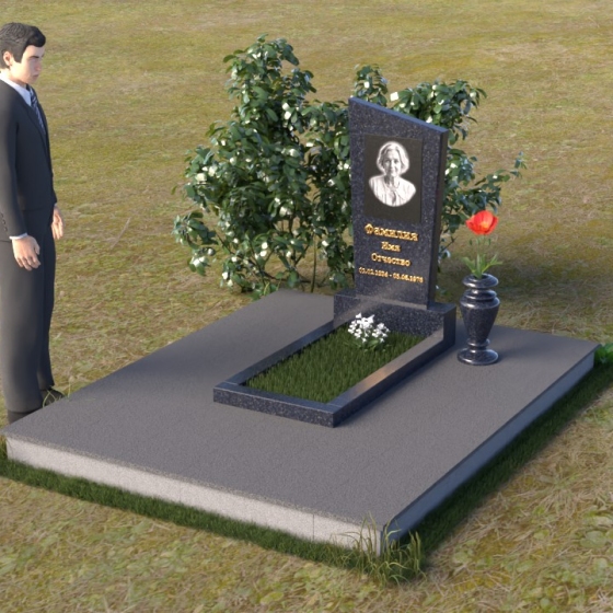Мемориальная композиция состоит из нескольких элементов, каждый из которых тщательно продуман и выполнен с безупречным качеством. Начинается все с основания – широкой, массивной плиты, которая обеспечивает устойчивость всей конструкции. Её матовая, слегка шероховатая поверхность призвана оттенять блеск полированных элементов, создавая игру фактур и контрастов. Далее взгляд переходит к горизонтальной стеле, расположенной на постаменте. Она выполнена в виде прямоугольника с плавными, скругленными углами, что придает ей мягкость и элегантность. Поверхность стелы отполирована до зеркального блеска, отражая небо и окружающий мир, словно напоминая о связи между земным и небесным. На постаменте возвышается вертикальная стела с портретом и надписью. Верхняя часть стелы имеет скошенный угол, что добавляет динамики и оригинальности всей композиции. На стеле выгравированы имя, фамилия и отчество усопшего, а также даты жизни, выполненные изящным шрифтом. В правом углу композиции расположена ваза, предназначенная для цветов. Её классическая форма и полированная поверхность гармонично дополняют общий стиль мемориала.