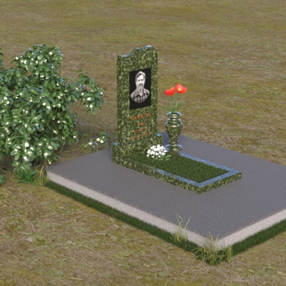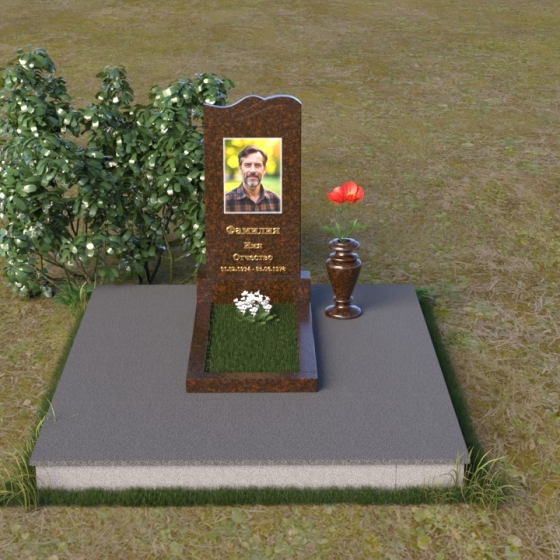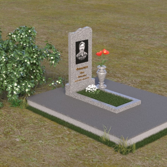 Этот гранитный монумент представляет собой вертикальную плиту с плавной, волнообразной линией верха, словно застывшая морская волна, несущая в себе покой и умиротворение. Боковые грани надгробного сооружения мягко скруглены, что придает ему изящный и завершенный вид. Верхняя часть памятника, обрамляющая портрет усопшего и памятную надпись, выполнена в строгом прямоугольном стиле, подчеркивая лаконичность и сдержанность дизайна. Нижняя часть памятника переходит в горизонтальную плиту, создавая единую композицию, гармонично вписывающуюся в окружающий ландшафт. Фаски по периметру обеих плит аккуратно сняты, что придает изделию дополнительную элегантность и законченность.