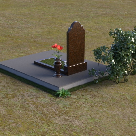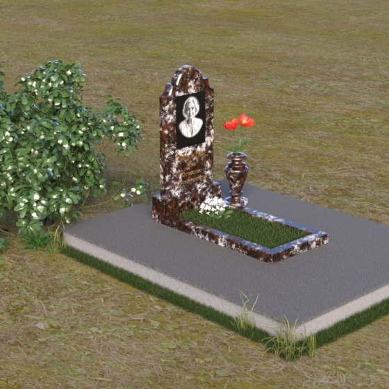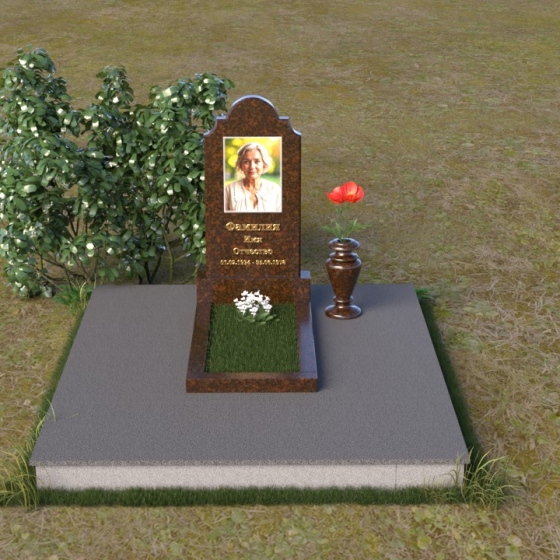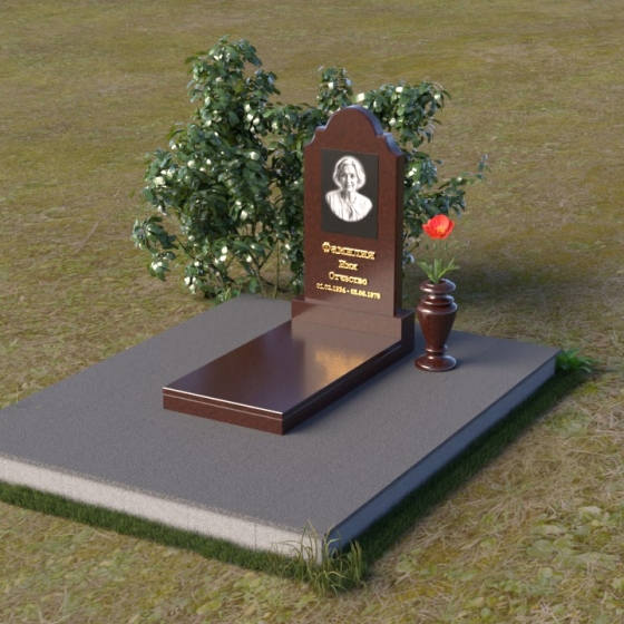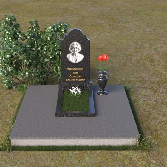 Мемориальная композиция ПВ 067 представляет собой вертикальную стелу, увенчанную плавной, изящной аркой. Верхняя часть стелы имеет аккуратно скругленные углы, что придает ей мягкость и утонченность. В верхней части стелы располагается овальный медальон с портретом. Нижняя часть стелы переходит в горизонтальную плиту, образуя единое целое. Плита имеет строгую прямоугольную форму с четкими гранями. Фаска по периметру плиты придает ей законченный вид и подчеркивает геометрию. Рядом со стелой установлена небольшая ваза из того же материала, выполненная в классическом стиле. Ее плавные линии и темный цвет гармонично сочетаются с основным элементом композиции.