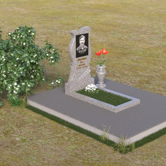 Памятник ПВ 114 представляет собой изысканную композицию, где плавные линии сочетаются с четкими геометрическими формами. Верхняя часть стелы имеет сложную, но гармоничную форму, напоминающую раскрывающийся бутон или стилизованное сердце. Верхние углы закруглены и образуют мягкие волны, словно вторя скорбным вздохам ветра. Боковые грани плавно сужаются к основанию, подчеркивая устремленность ввысь. В центре стелы располагается углубление, очерченное полированной полосой, создающее эффект обрамления для портрета усопшего и эпитафии, написанной золотым шрифтом, словно сияющей в вечности. В нижней части стелы вырезана изящная волна, отделяющая верхнюю часть от основания. Полированная поверхность камня отражает небо и окружающий мир, создавая ощущение легкости и воздушности. Подставка под стелой, также выполненная из полированного гранита, имеет строгие прямоугольные формы, контрастирующие с плавными линиями верхней части. Рядом с памятником установлена небольшая ваза из черного гранита, предназначенная для живых цветов, символизирующих непреходящую любовь и память.