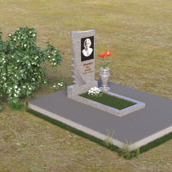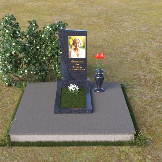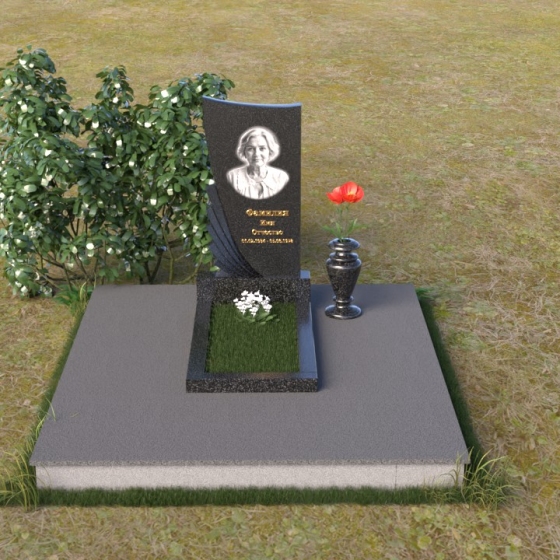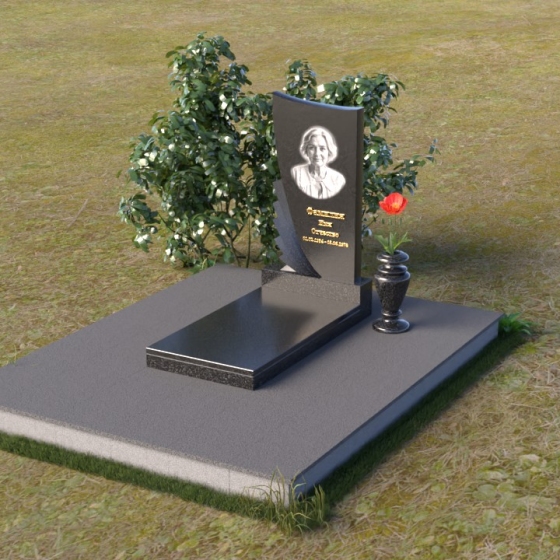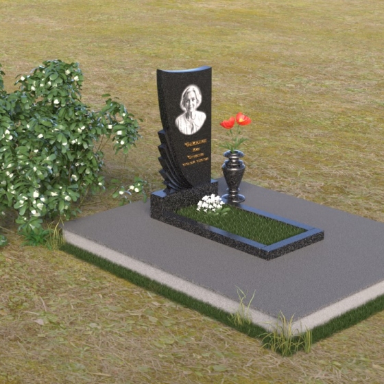 Мемориальная композиция ПВ 116 представляет собой элегантное сочетание строгой геометрии и плавных линий. Основная стела имеет прямоугольную форму с асимметричным срезом в верхней части, создающим динамичный, устремленный вверх силуэт. Верхний край плавно изогнут, напоминая склоненную голову в скорби или крыло ангела, оберегающее покой усопшего. Левая боковая грань стелы украшена глубокой резной деталью, напоминающей стилизованную волну или языки пламени. Эта деталь выполнена с матовой фактурой, создавая выразительный контраст с зеркальной полировкой остальной поверхности камня. Подставка под стелу выполнена в форме прямоугольной плиты с полированными фасками, что придает композиции завершенный и аккуратный вид. Дополнительная горизонтальная плита, установленная перед стелой, также имеет зеркальную полировку, отражая небо и окружающий пейзаж, что визуально расширяет пространство и создает ощущение легкости.